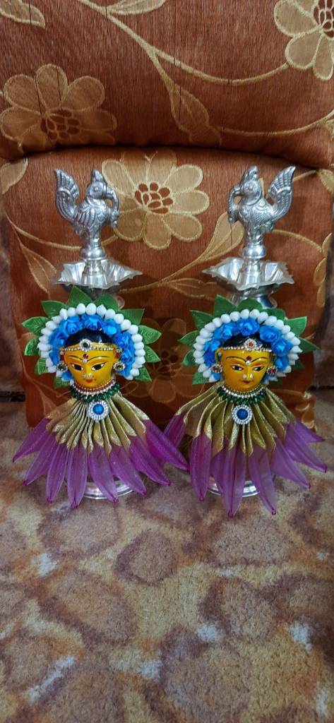 Sumathi has been decorating dolls independently since 2001. She acquired a taste for this art while in school. She used to watch her mom and her aunt work their magic and turn the wooden figures into mesmerising figurines. Every year she decorates about 12-15 orders pairs of dolls.