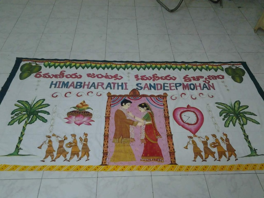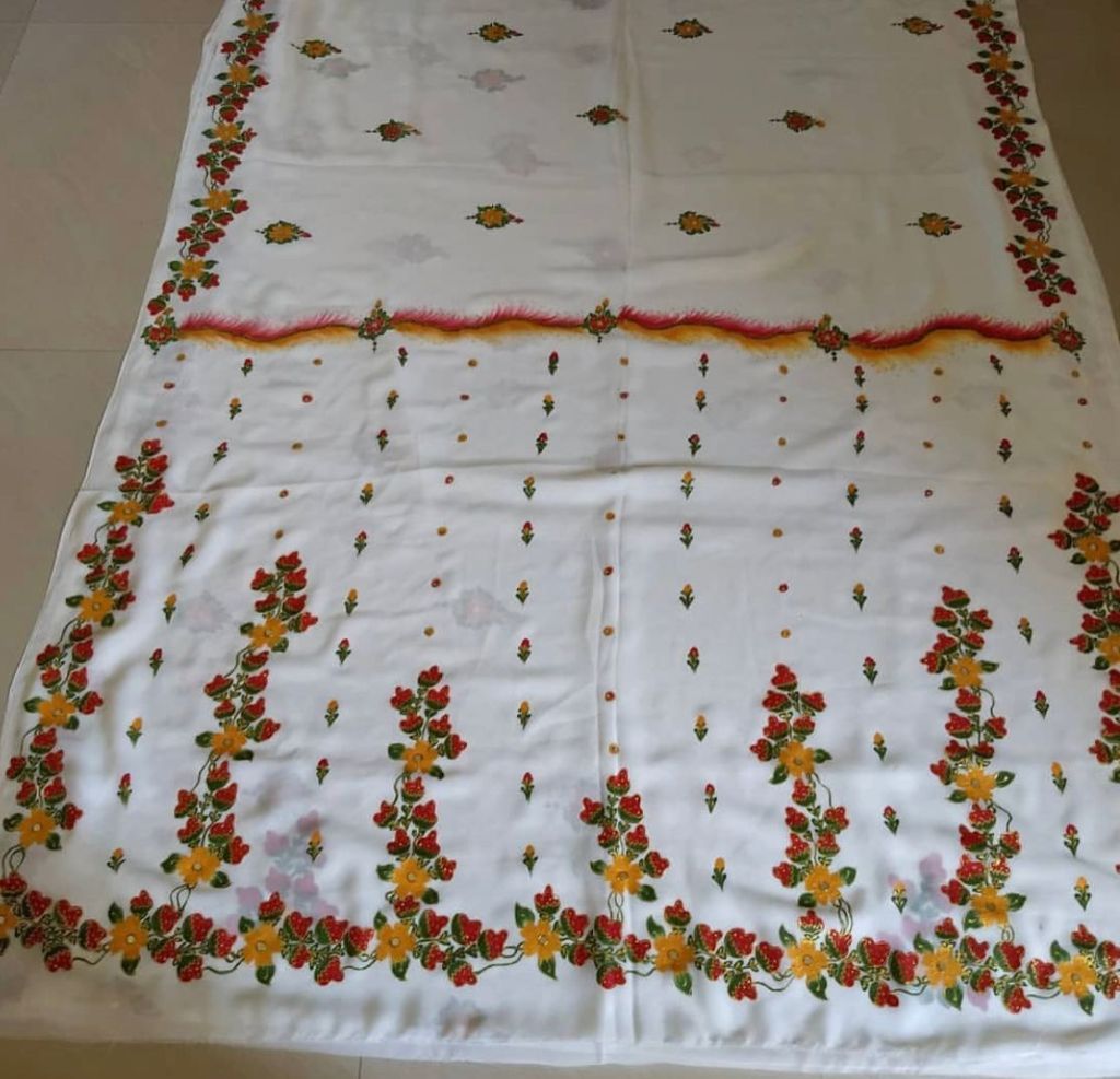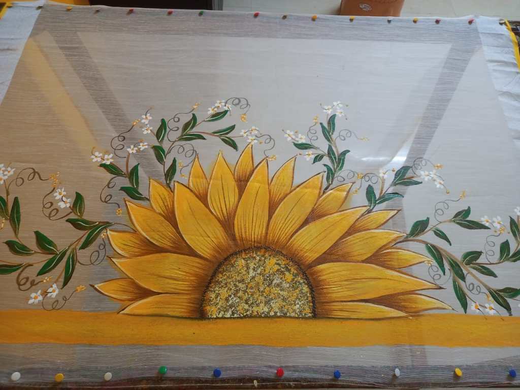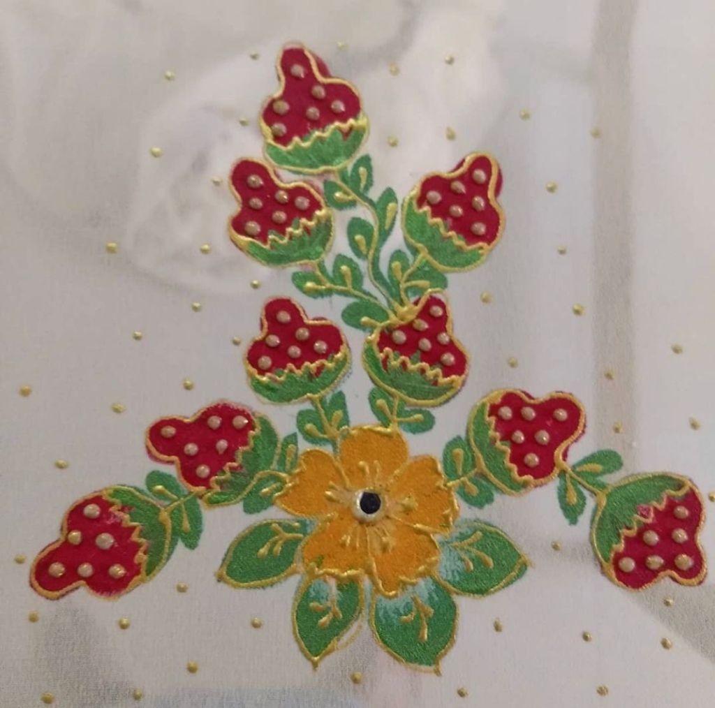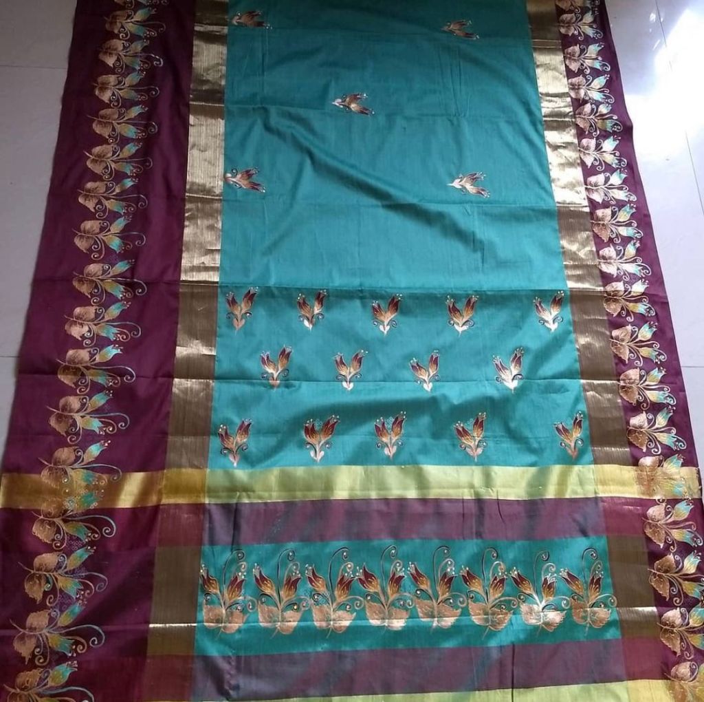 Anitha was born and raised in Kurnool, Andhra Pradesh in India. She is currently residing in Bangalore. She is an expert in wearable art and has been working on enhancing visual appearance of sarees for nearly two decades. Anitha got interested in arts from a very young age. She took painting lessons in Hyderabad. It takes her anywhere between 2 days to a week to paint a saree.